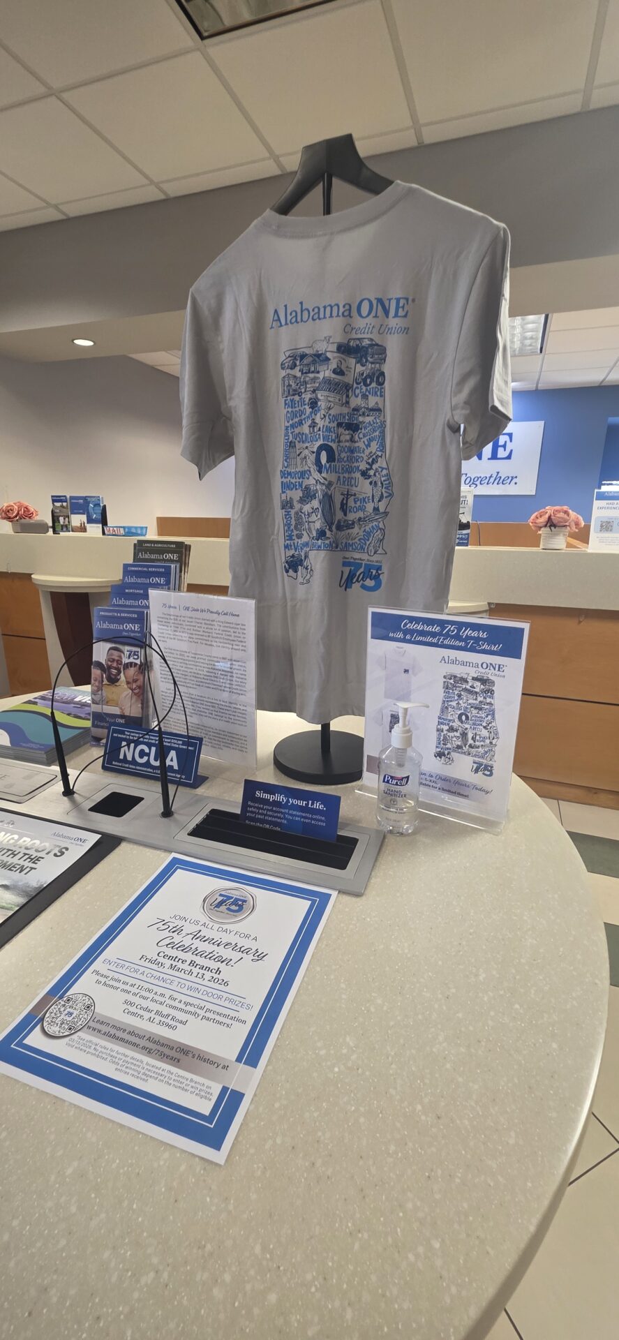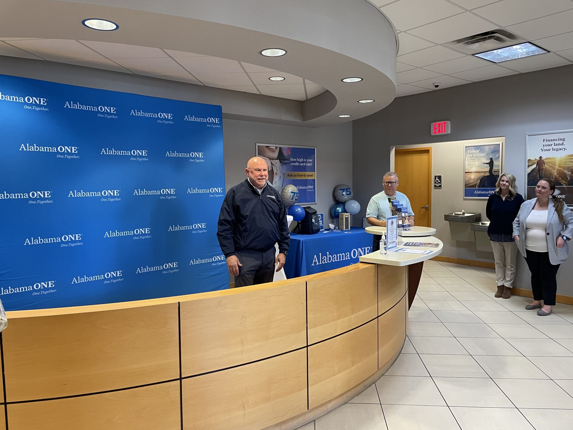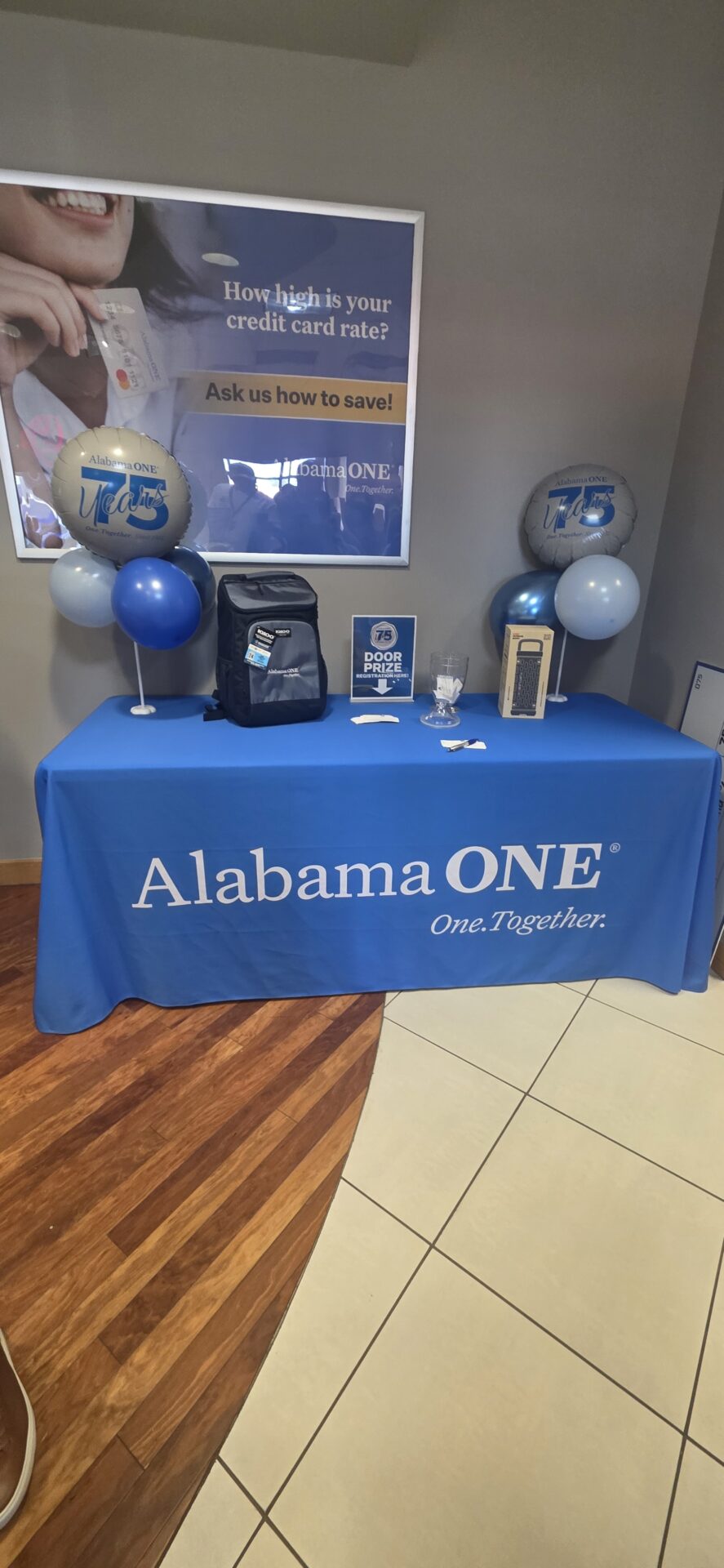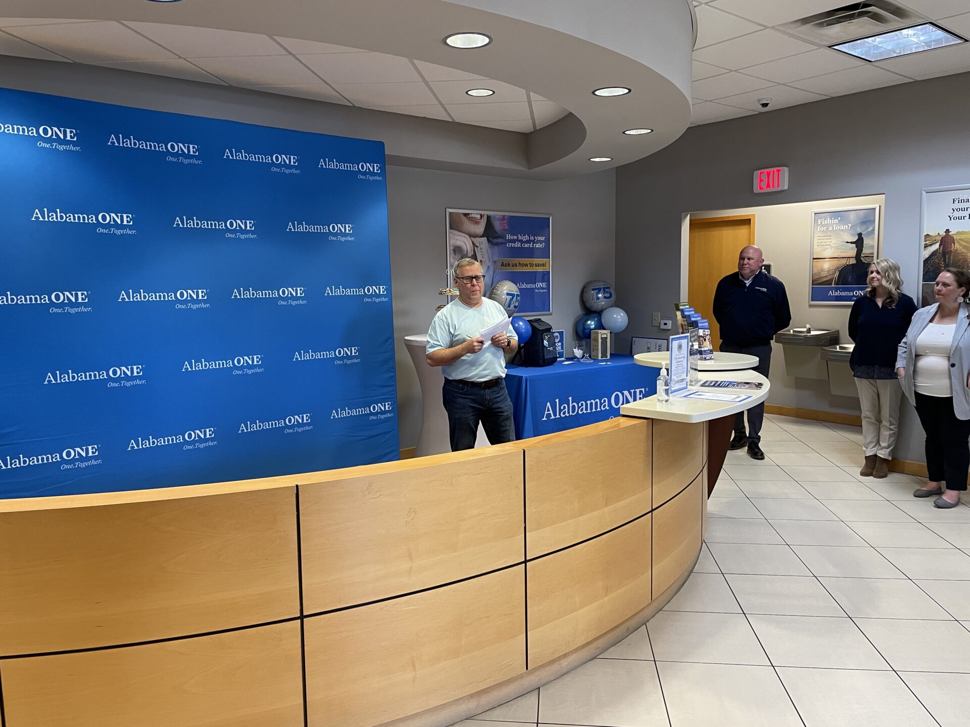 Following the formal remarks, the celebration continued throughout the remainder of the business day. Visitors were invited to stop by the branch to enjoy refreshments, giveaways and displays commemorating the credit union’s 75-year history. New Alabama ONE T-shirts were also available for purchase during the event.