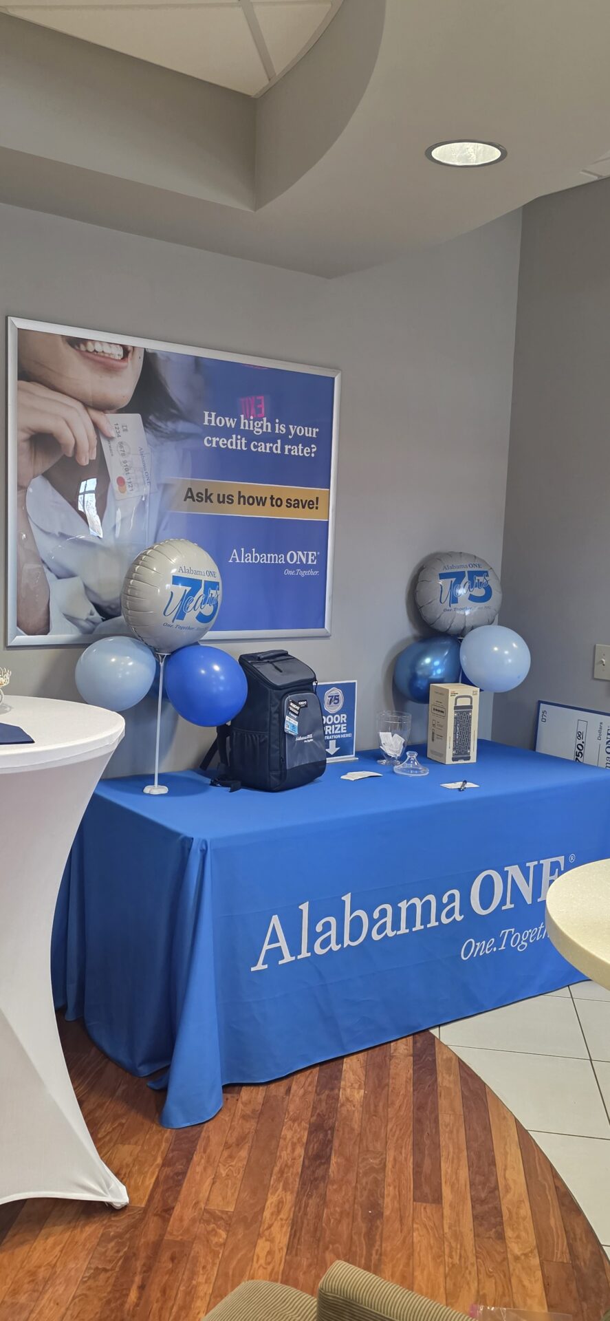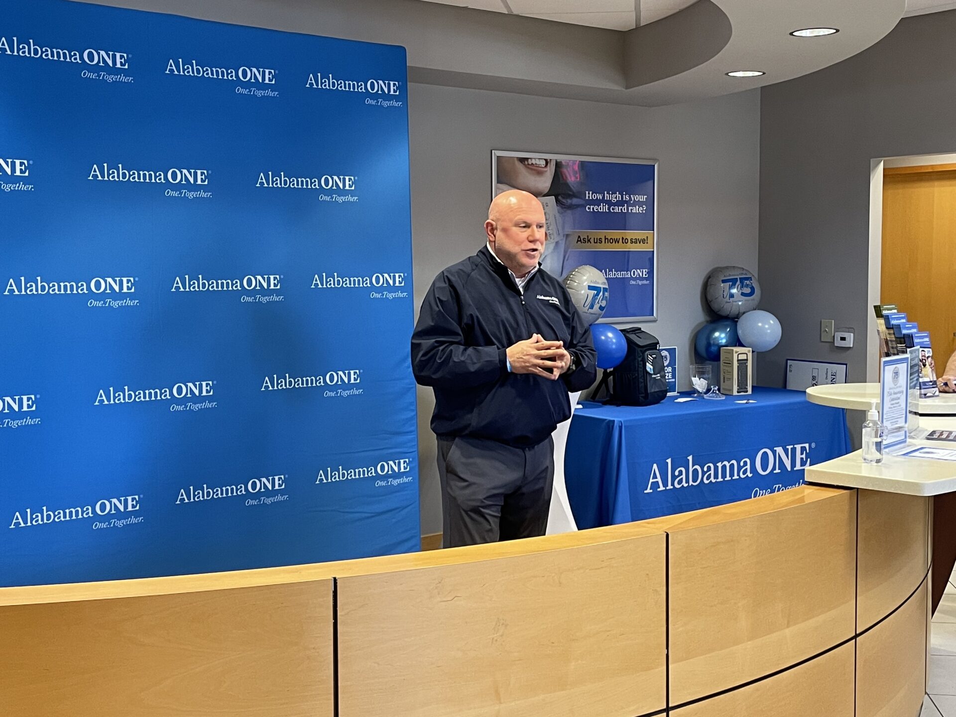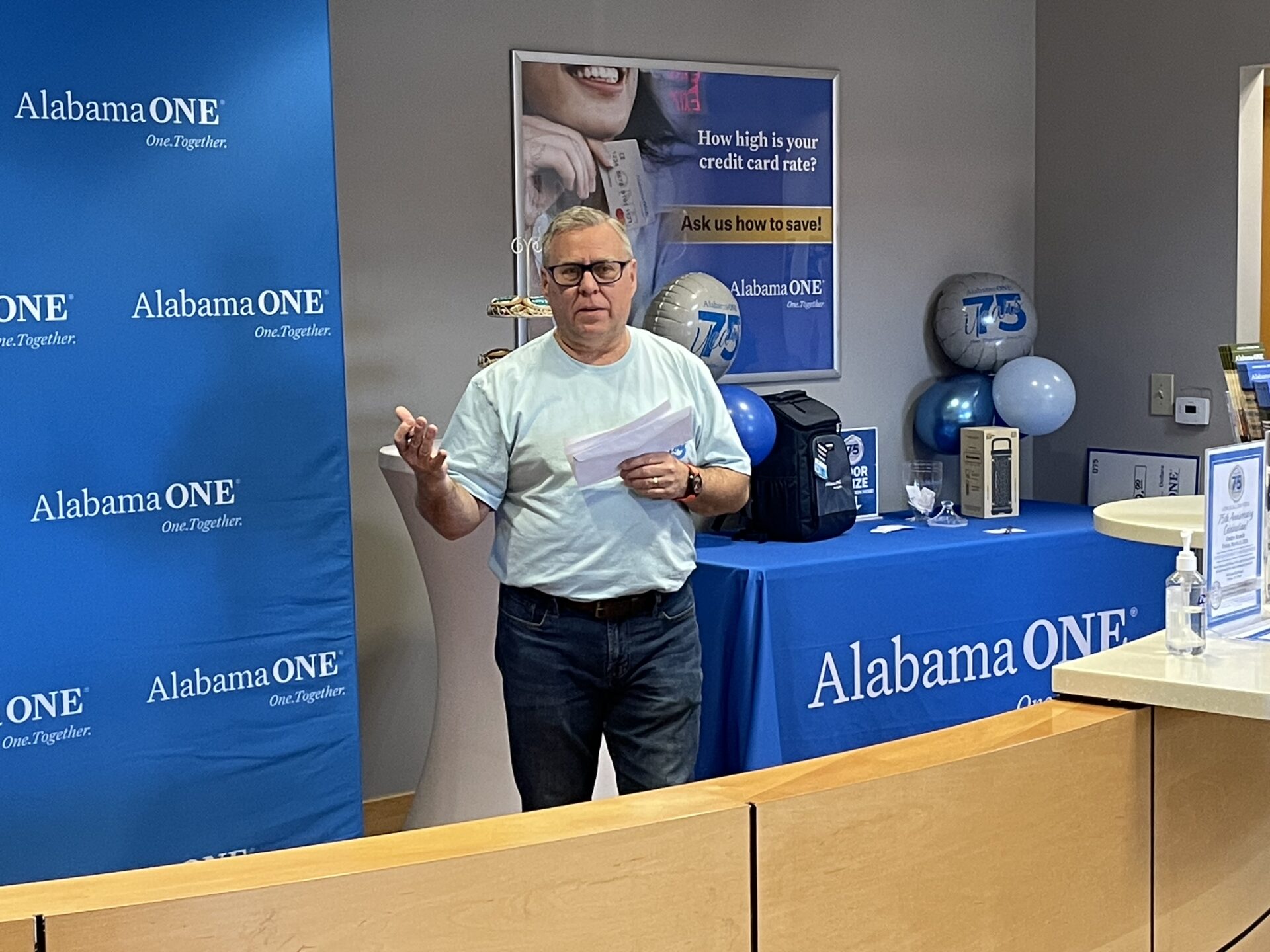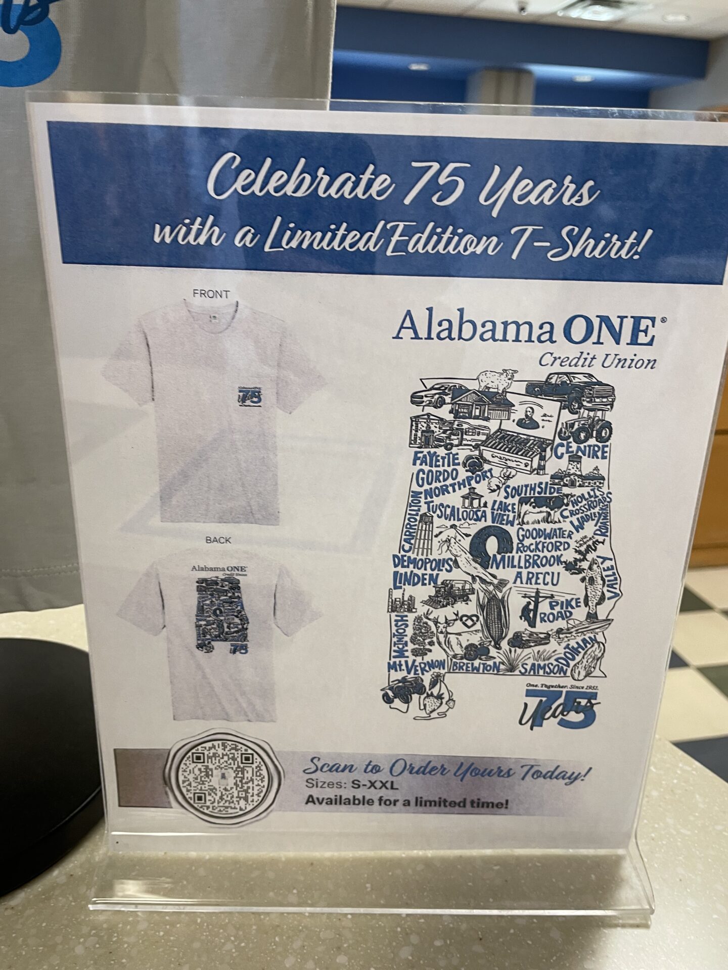 Following the formal remarks, the celebration continued throughout the remainder of the business day. Visitors were invited to stop by the branch to enjoy refreshments, giveaways and displays commemorating the credit union’s 75-year history. New Alabama ONE T-shirts were also available for purchase during the event.