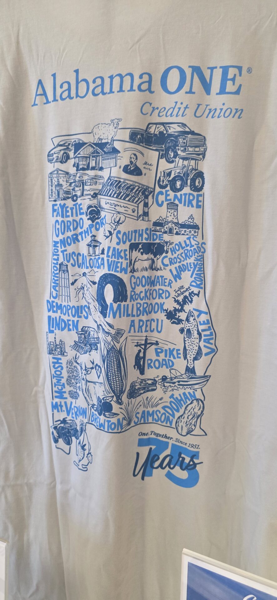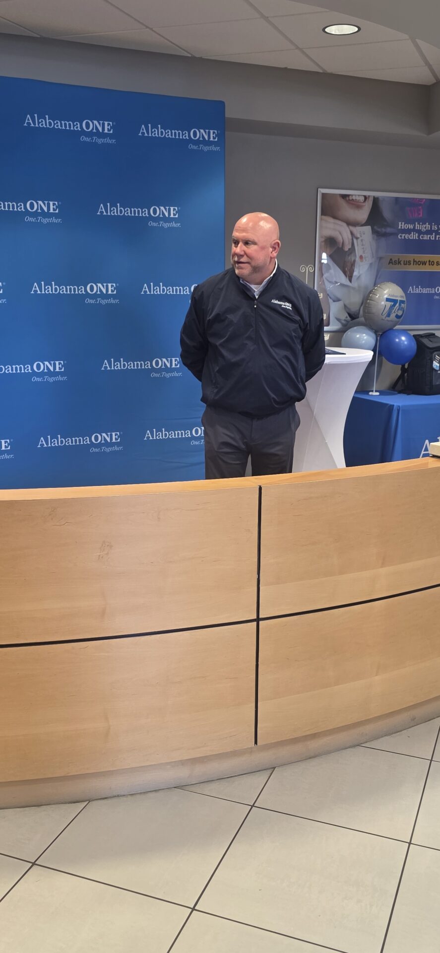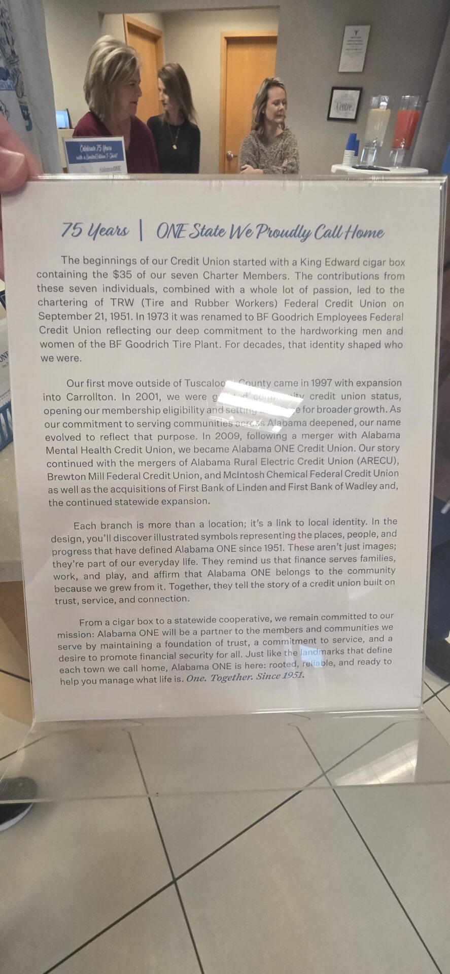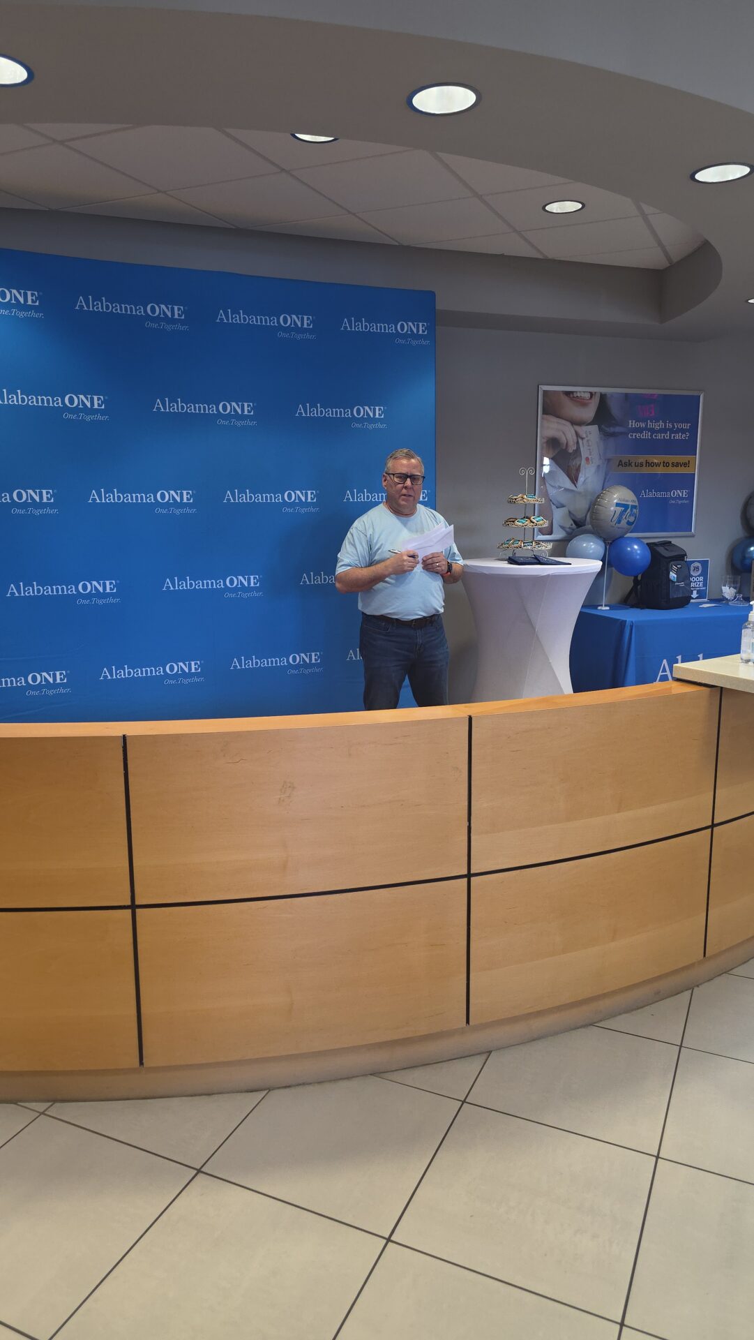 Following the formal remarks, the celebration continued throughout the remainder of the business day. Visitors were invited to stop by the branch to enjoy refreshments, giveaways and displays commemorating the credit union’s 75-year history. New Alabama ONE T-shirts were also available for purchase during the event.