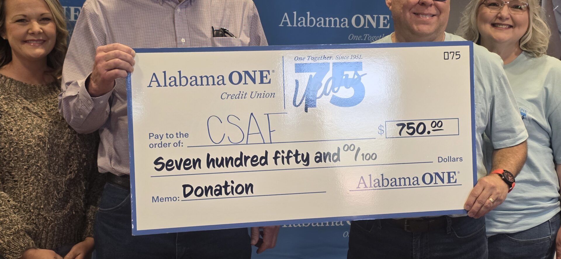 Gossett thanked members of the CSAF board who were present before presenting the organization with a donation on behalf of Alabama ONE.