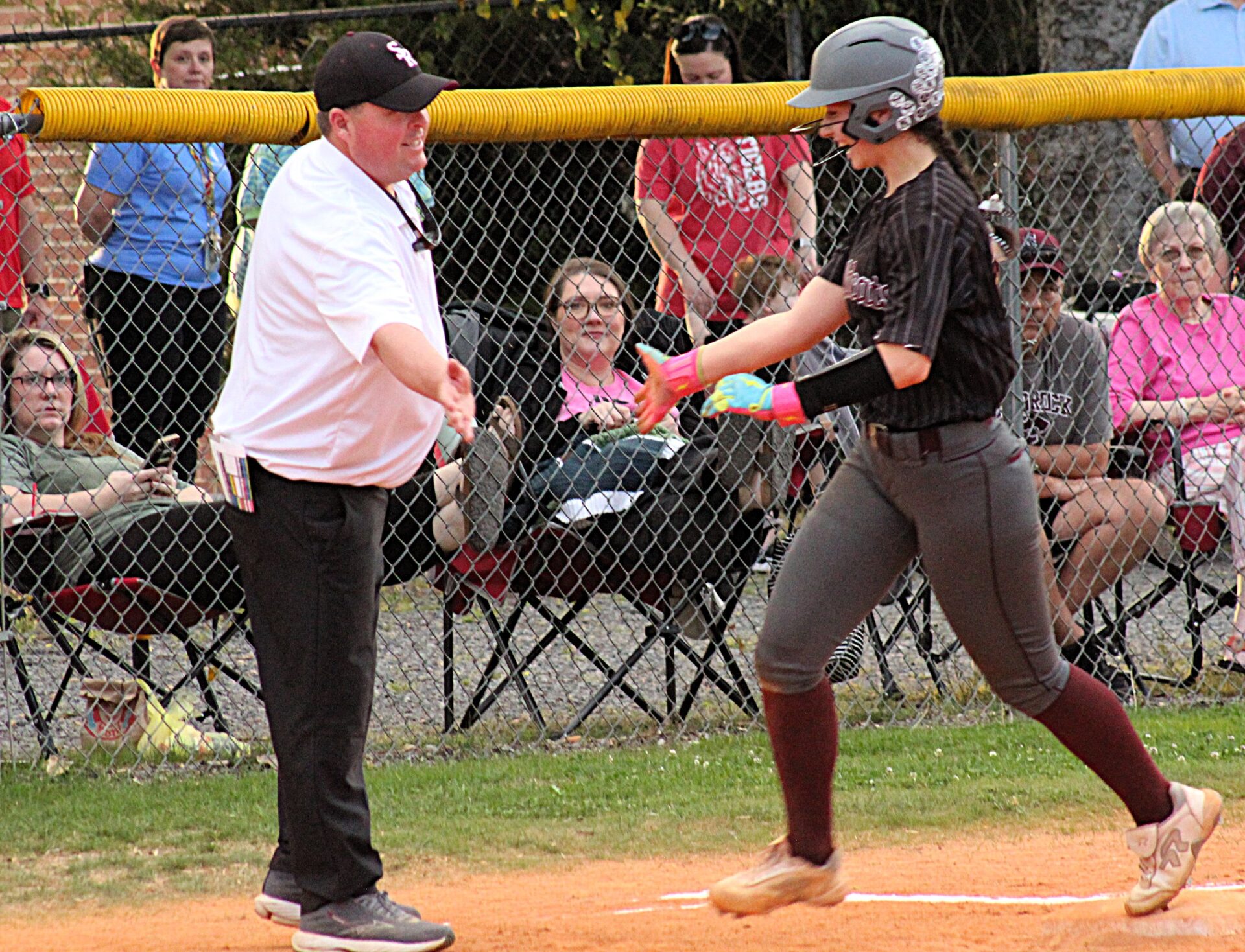 Sand Rock’s Emma Sipsy rounds third base and gets congratulated by head coach Josh Bates following her 3-run homer to left field in the top of the sixth inning of the Lady Wildcats’ softball game at Sand Rock on Thursday. Photo by Shannon Fagan.