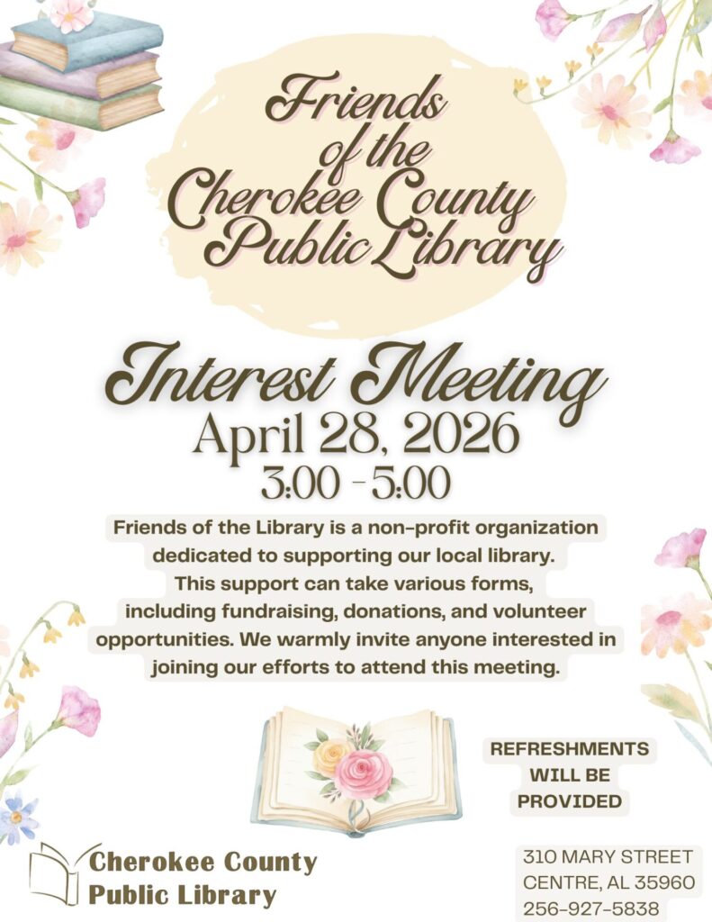 CENTRE, Ala. — Community members interested in supporting the local library are invited to attend an upcoming interest meeting for the Friends of the Cherokee County Public Library.