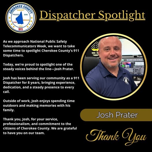 Today’s spotlight is on Josh Prater, one of the steady voices behind the line for Cherokee County. Prater has served the community as a 911 dispatcher for the past eight years, bringing experience, dedication, and a calm, steady presence to every call he handles.