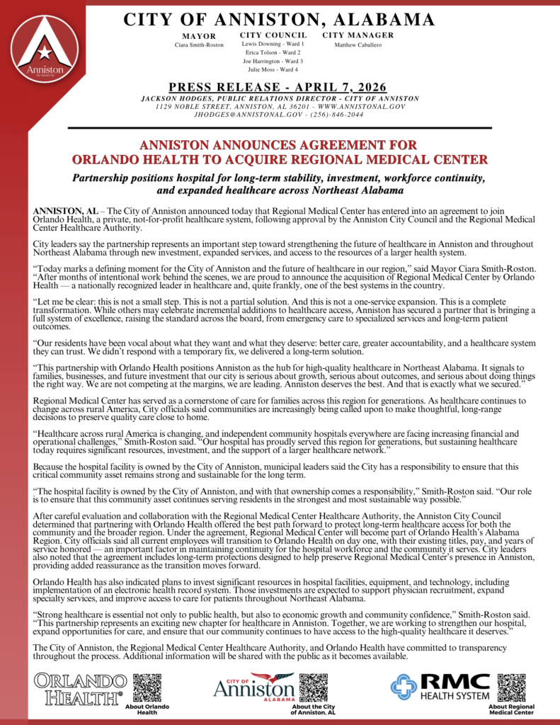 “Today marks a defining moment for the City of Anniston and the future of healthcare in our region,” Smith-Roston said. “After months of intentional work behind the scenes, we are proud to announce the acquisition of Regional Medical Center by Orlando Health — a nationally recognized leader in healthcare.”