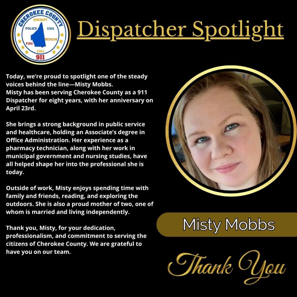 Cherokee County E911 Spotlights Dispatcher Misty Mobbs During Telecommunicators Week