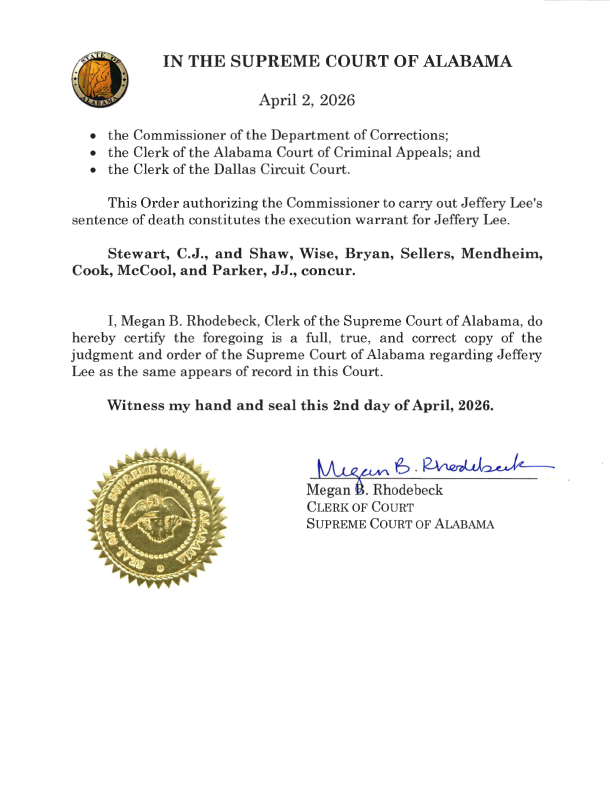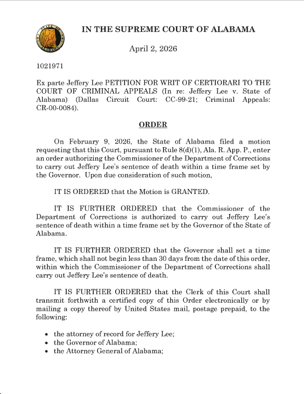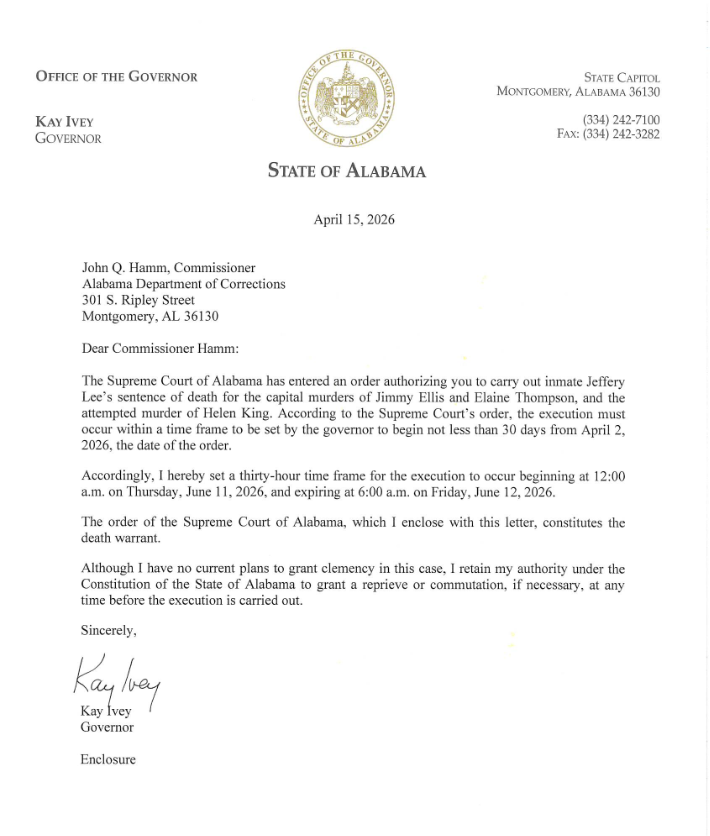 MONTGOMERY — Governor Kay Ivey on Wednesday set the execution window for Alabama death row inmate Jeffery Lee, scheduling it to begin at 12:00 a.m. on Thursday, June 11, 2026, and expire at 12:00 a.m. on Friday, June 12, 2026.