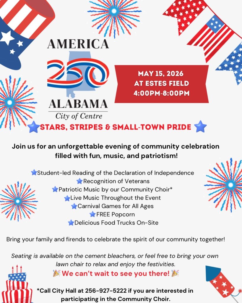 CENTRE— The City of Centre is inviting residents and visitors alike to come together for an evening of patriotism, music, and small-town pride during its “America 250” celebration on Friday, May 15.